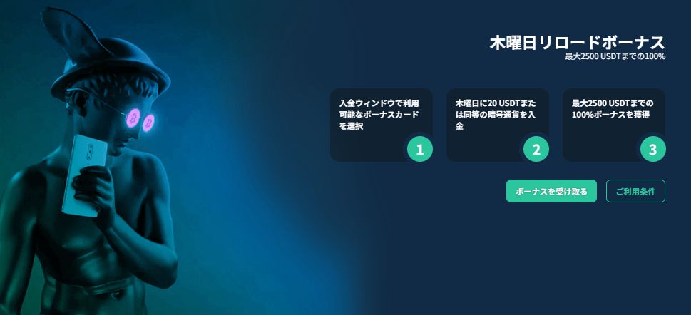毎週木曜日限定のリロードボーナス。入金するだけで100%・最大2,500 USDTのボーナスが受け取れます。