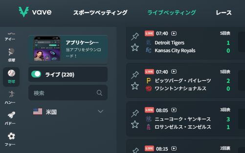 野球はイニングごとに流れが変わるスポーツ。Vaveカジノのライブベットならイニング間・打席間にオッズがリアルタイム更新されるため、展開を見ながらベットできます。NPB・MLBの主要試合はライブストリーミングに対応しているケースもあり、Vave画面1枚で「視聴+ベット」が完結します。