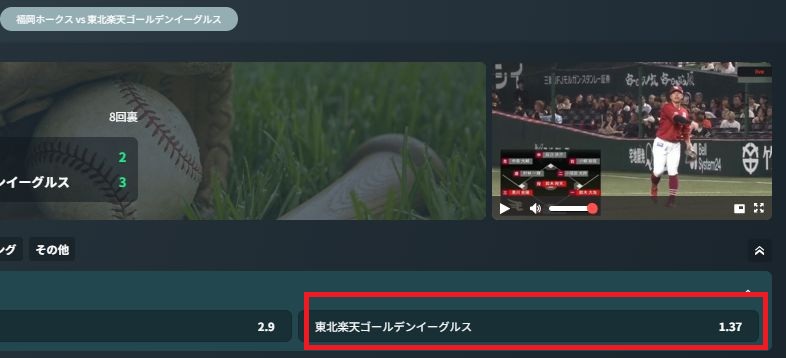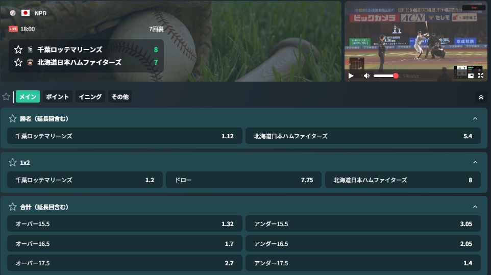 - ライブベット (インプレー) で試合中もリアルタイム参戦