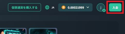 ログイン後、画面右上にある「入金」ボタンをクリックしてキャッシャー(ウォレット画面)を開きます。スマホの場合はメニュー内にあります。
