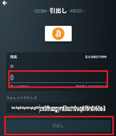 出金する仮想通貨を選択し、出金額と、自分のウォレットアドレス (取引所の受取アドレスなど) を入力します。アドレスは必ずコピー&ペーストで正確に入力してください。入力が終わったら「出金する」ボタンで申請します。