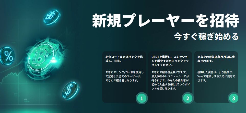 友人をVaveカジノに招待すると、友人のベット収益の一部を継続的に受け取れるプログラムです。紹介人数によってランクが上がり、シェア率も増えます。