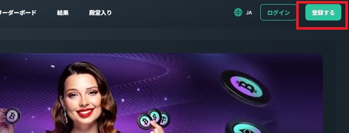 公式サイトが開いたら、画面右上にある「登録」ボタンをクリックします。スマホの場合はメニュー内に「登録」ボタンがあります。