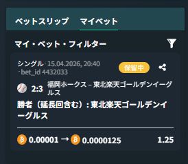 「ベットする (Place Bet)」ボタンでベット成立。試合結果の確定後、当選していればベット履歴に反映され、残高に自動精算されます。