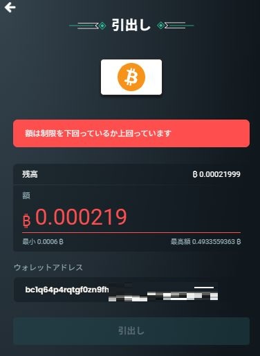 各通貨ごとに最低出金額が設定されています。下記の画像のように出金額が最低額を満たしていないと申請が通らないため、出金画面に表示される最低額を必ず確認してから申請してください。